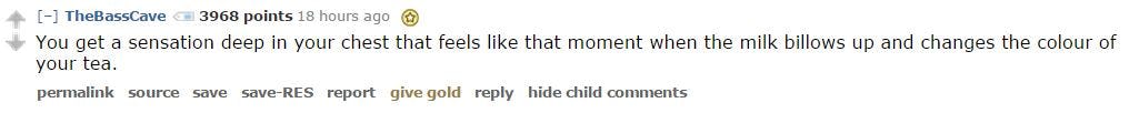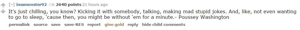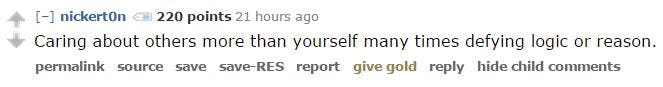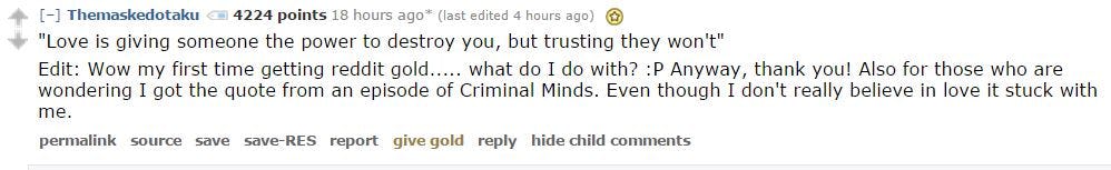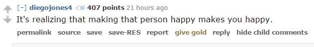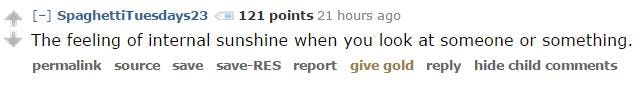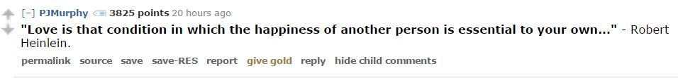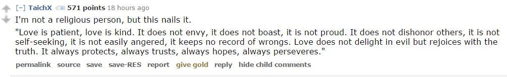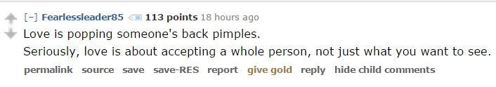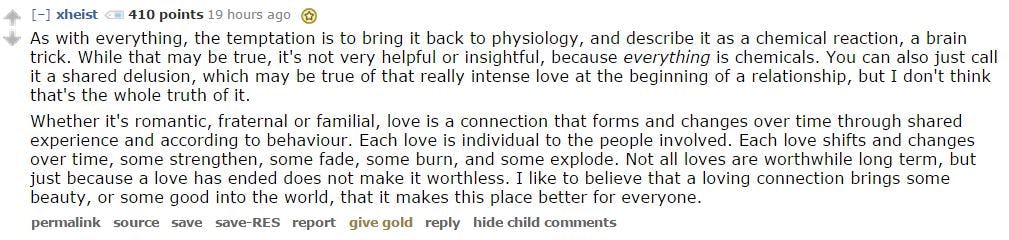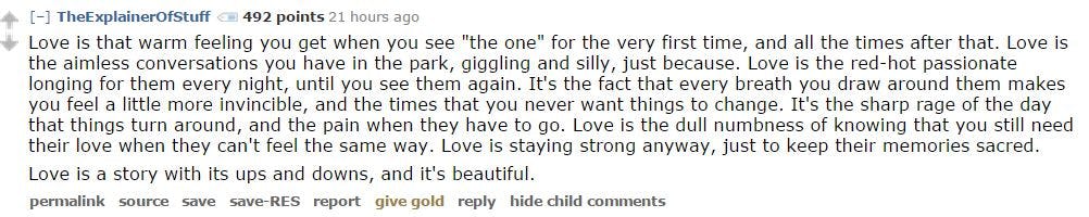 But it turns out Reddit can get quite poetic when stripped of its comedic crutches. Some quoted other wise and occasionally hilarious people; others came up with some beautiful turns of phrases all their own; and overall, there’s a lot of really gorgeous stuff in there. Love is many things — and often different things to different people — but there’s room for every single possible definition within its warm and welcoming embrace. Taken together, they’re all part of a whole, with plenty of space left to keep adding to it. Reddit doesn’t often make me feel warm and fuzzy, but today, it definitely has.