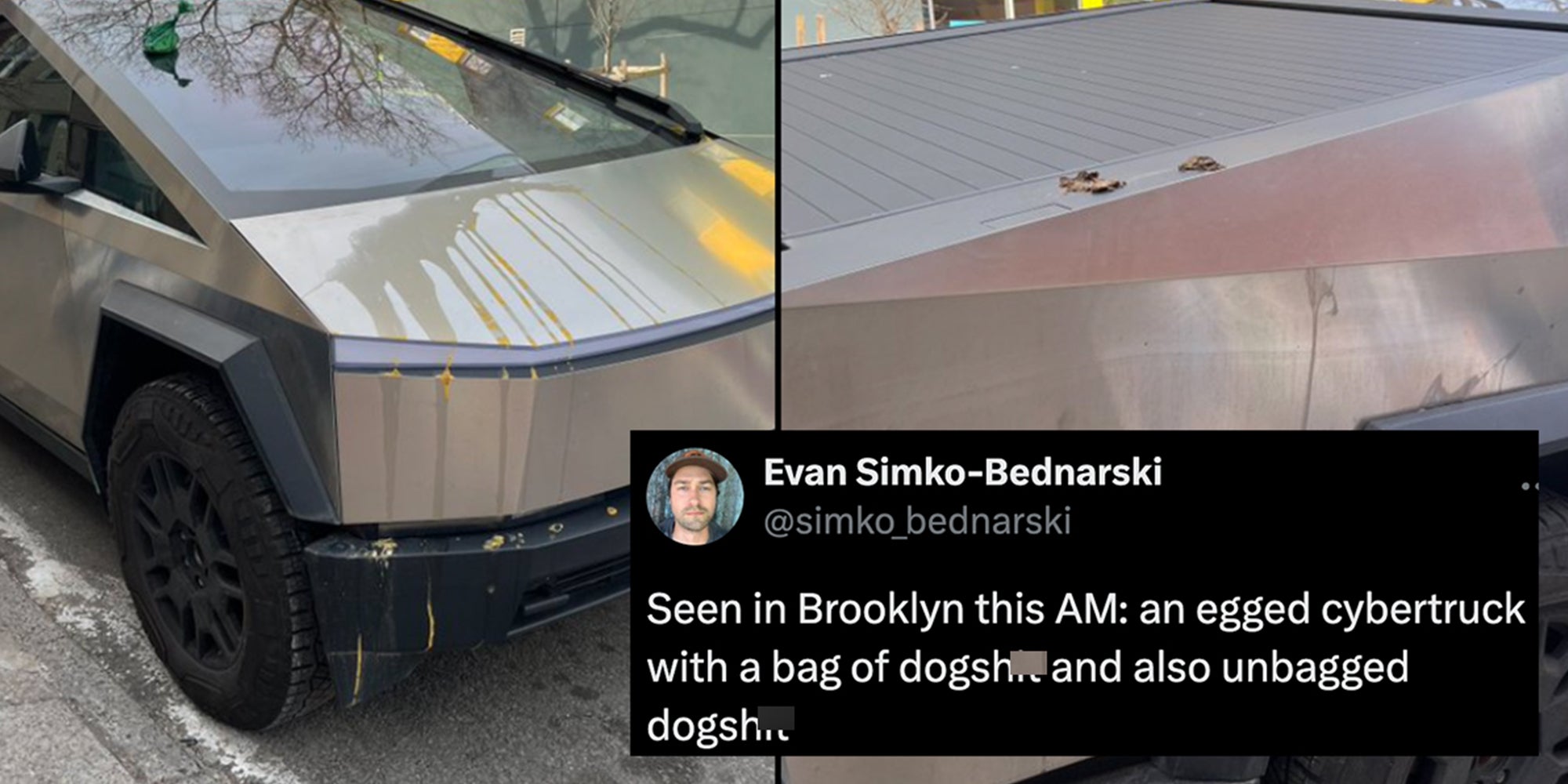 Photos on X show a Cybertruck in Brooklyn covered in broken eggs and unbagged dog poop.