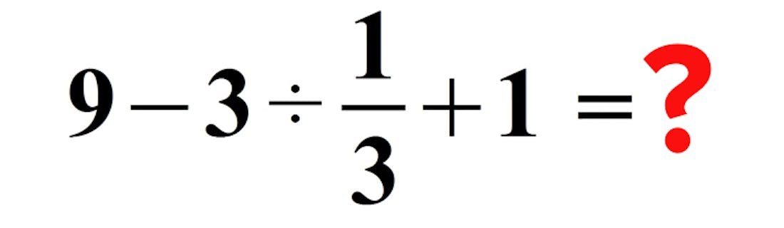 But negative one isn't the only wrong answer. Other people got tricked by the "three divided by one third" part, largely because they were too crafty for their own good. They neglected to account for the fact that, if you turn the fraction one third into 1/3, the /, mathematically speaking, is actually a division symbol. The result is this:
