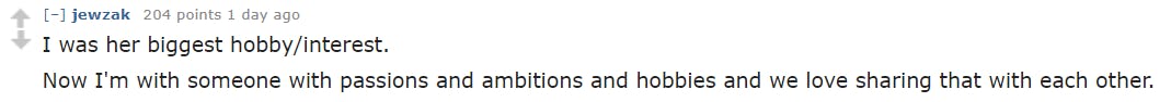 There's nothing wrong with enjoying your partner's company and valuing your time together. But if someone has zero interests or hobbies outside of their relationship, that's a red flag.