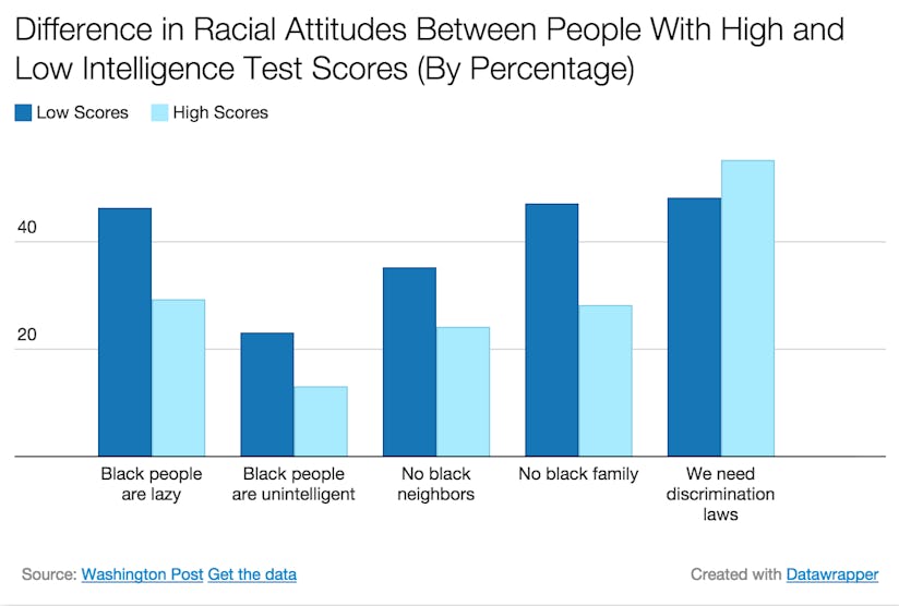 Twenty-three percent of low scorers described black people as unintelligent, as opposed to 13% of high-scorers. To reiterate: More than 1 in 10 "intelligent people" surveyed think that black people have a lower mental capacity than the average Joe.
