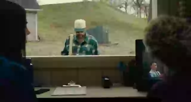 Sandler is walking towards a check-in booth holding golf clubs and as he approaches, the person working behind the desk is apparently watching TV.