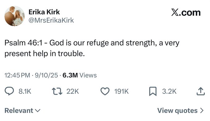 In a post on X, formerly Twitter, she wrote at 12:45pm: “Psalm 46:1 – God is our refuge and strength, a very present help in trouble.”