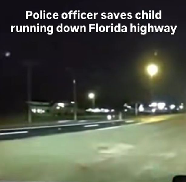 A Florida police officer is being hailed as a hero after saving a small child who was spotted running alone down a dark highway in the middle of the night. Dashcam footage captured the heart-stopping moment when the officer swerved, stopped traffic, and sprinted toward the child just seconds before tragedy could strike.