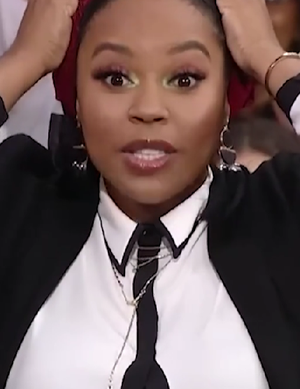 Dressed in sleek all-black and with a flawless beat, the woman calmly held up the hair wrap and said: