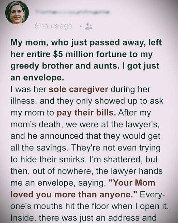 When the lawyer began reading my mother’s will, I thought I already knew what to expect. She had always been generous with my brother and our aunts, even when they rarely visited her. I, on the other hand, had spent years by her side — through the long nights, hospital stays, and quiet moments of laughter that no one else saw. So when I heard that her $5 million estate was going entirely to them, my heart sank. Everyone celebrated their newfound fortune, while I sat there in silence, holding the single thing she left me — a plain envelope with my name written in her careful handwriting.