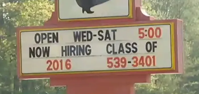 Closeup shot of the strip club’s sign encouraging recent high school graduates to come work for them, Photo Credit: SanVic