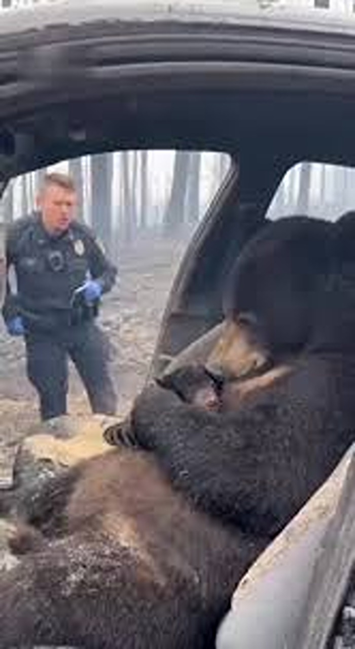 Inside a charred car sat a mother bear, her fur burned, her breath faint. In her arms lay her cub — lifeless. She didn’t run. She just stayed, guarding her baby through the smoke and ash.
