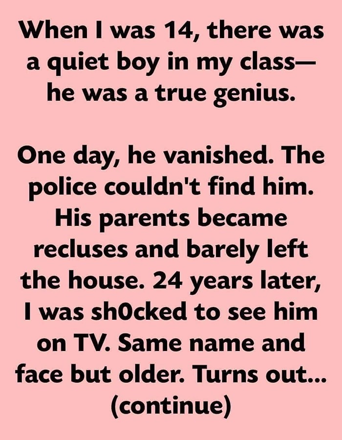 When I was 14, there was a quiet boy in my class— he was a true genius. One day, he vanished. The police couldn’t find him. His parents became recluses and barely left the house24 years later, I was shocked to see him on TV. Same name and face but older. Turns out he was recruited by the government at a young age due to his exceptional intelligence. Everything was top secret; his parents knew he wasn’t truly missing, but had to maintain the illusion of his disappearance.