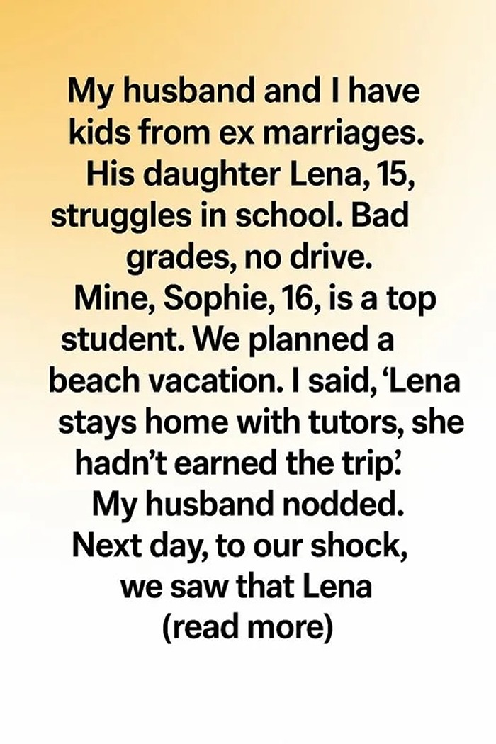 My husband and I have kids from ex marriages. His daughter Lena, 15, struggles in school. Bad grades, no drive. Mine, Sophie, 16, is a top student. We planned a beach vacation. I said, ‘Lena stays home with tutors, she hadn’t earned the trip.’ My husband nodded. Next day, to our shock, we saw that Lena was already awake at 5 AM, sitting at the kitchen table surrounded by notebooks and textbooks — eyes red but determined.