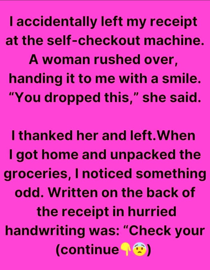 I accidentally left my receipt at the self-checkout machine. A woman rushed over, handing it to me with a smile. “You dropped this,” she said. I thanked her and left.