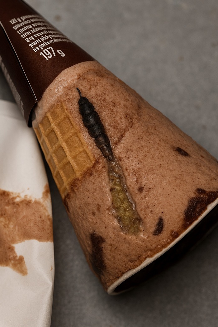 We froze, stunned. The first question that hit me was how on earth could it have ended up there? Maybe it happened at the factory while filling the cones? Or, worse, maybe it got in afterward and froze inside the dessert?