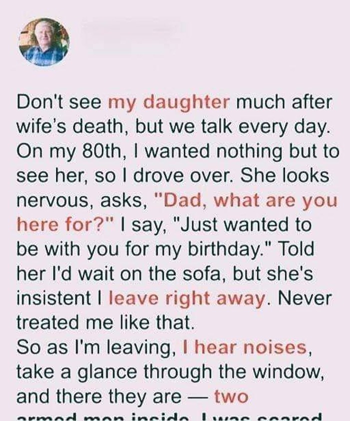 She looks nervous, asks, “Dad, what are you here for?” I say, “Just wanted to be with you for my birthday.”