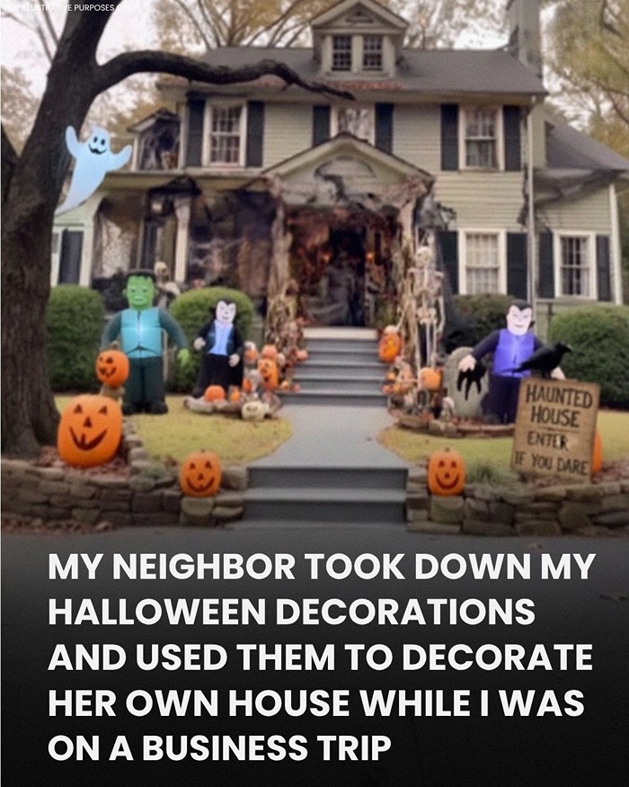 For a moment, I thought I had the wrong house. Then I looked across the street. There they were. My gravestones, my skeletons, my glowing pumpkins, all proudly displayed on my neighbor’s lawn. Even my giant spider perched on her roof as if mocking me.