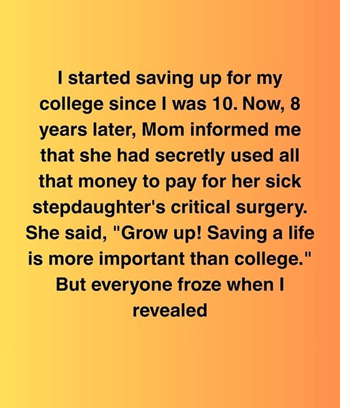 I started saving up for my college since I was 10. Now, 8 years later, Mom informed me that she had secretly used all that money to pay for her sick stepdaughter’s critical surgery. She said, “Grow up!