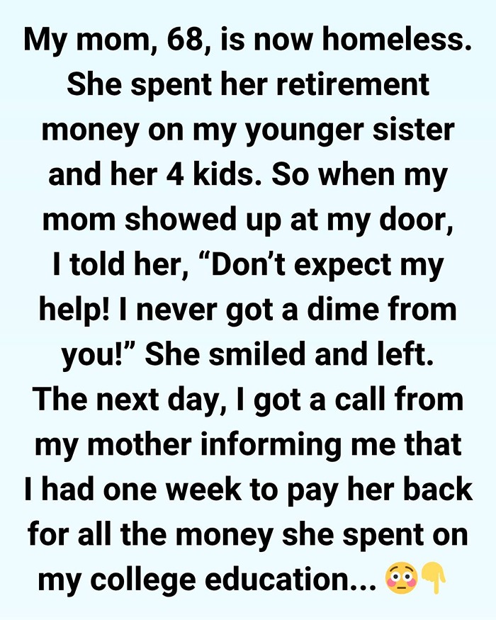 The next day, while I was at work, my mother called and said I had one week to repay all the money she had spent on my college education. I assumed she was just upset and didn’t take her seriously. But when I came home later, I was stunned to find her waiting outside my house, looking furious.