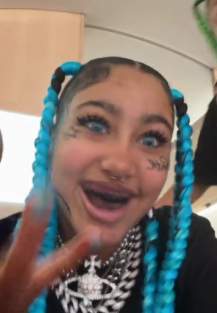In the clips, North can be seen rocking bright blue braids, fake face tattoos, blue contact lenses, black grillz, and even a pretend nose ring! Her look was completed with an oversized black T-shirt, baggy shorts, chunky sneakers, and layers of silver jewelry.