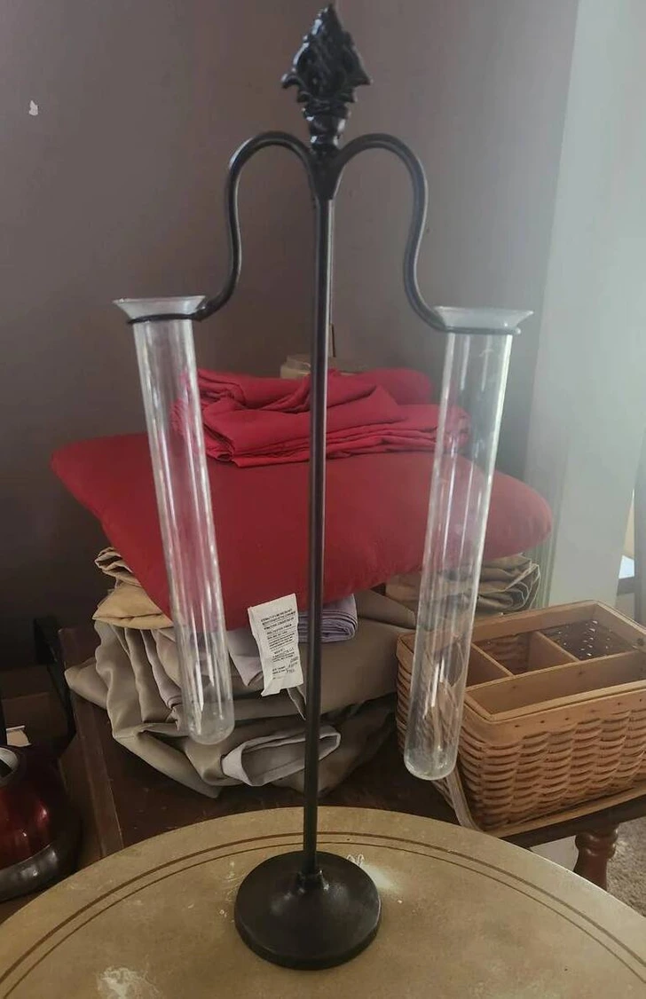 12. “Found while thrifting. Maybe a bud vase of sorts? Metal stand with glass test tubes.”