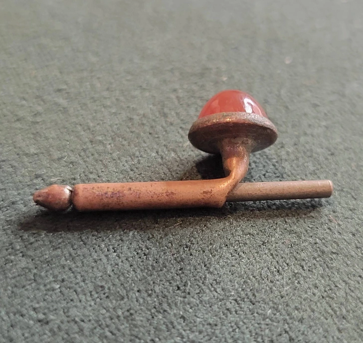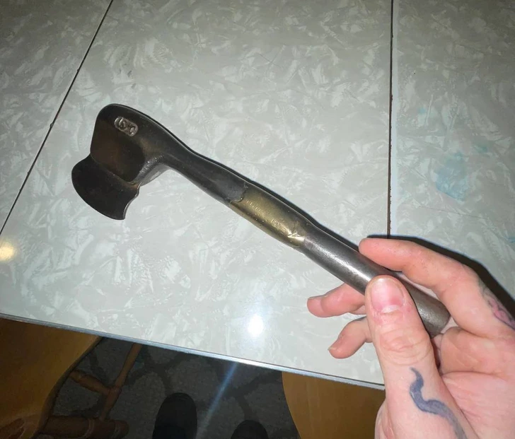 9. “Heavy metal axe shaped tool I found in a box of old tools. Mostly steel with brass brazing on the handle.”
