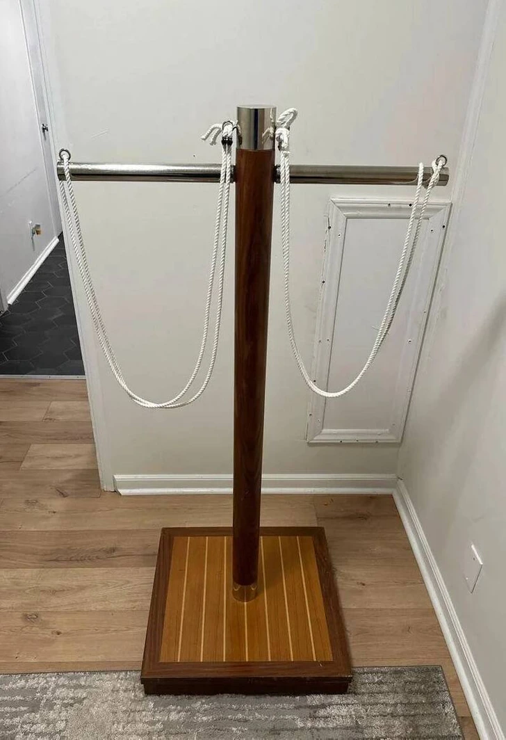6. “On wood post on wooden base with caster wheels on all corners to roll it around.”