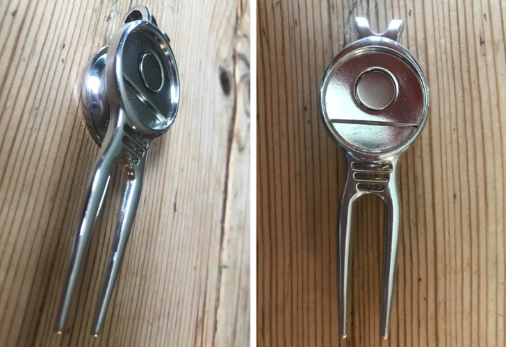 Answer: This is a ball mark fixer for golfing. The 2 prongs go into the ground to lift the green where your golf ball made its initial crater. The magnetic coin (yours is missing) is, so you can mark your golf ball on the green, so others can putt without your ball in the way.