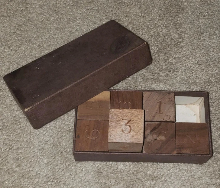 1. “Six numbered wooden cubes in a very old cardboard box”