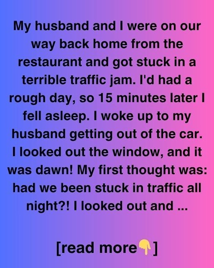 We were halfway home from dinner when traffic came to a complete standstill. Exhausted, I closed my eyes “just for a minute.” When I woke, dawn light filled the car—no highway, no brake lights. Instead, we were parked by an old gas station in a quiet town. My husband walked up with coffee and a paper bag, smiling like nothing was strange. “Got tired of waiting,” he said. “Took the back roads.”