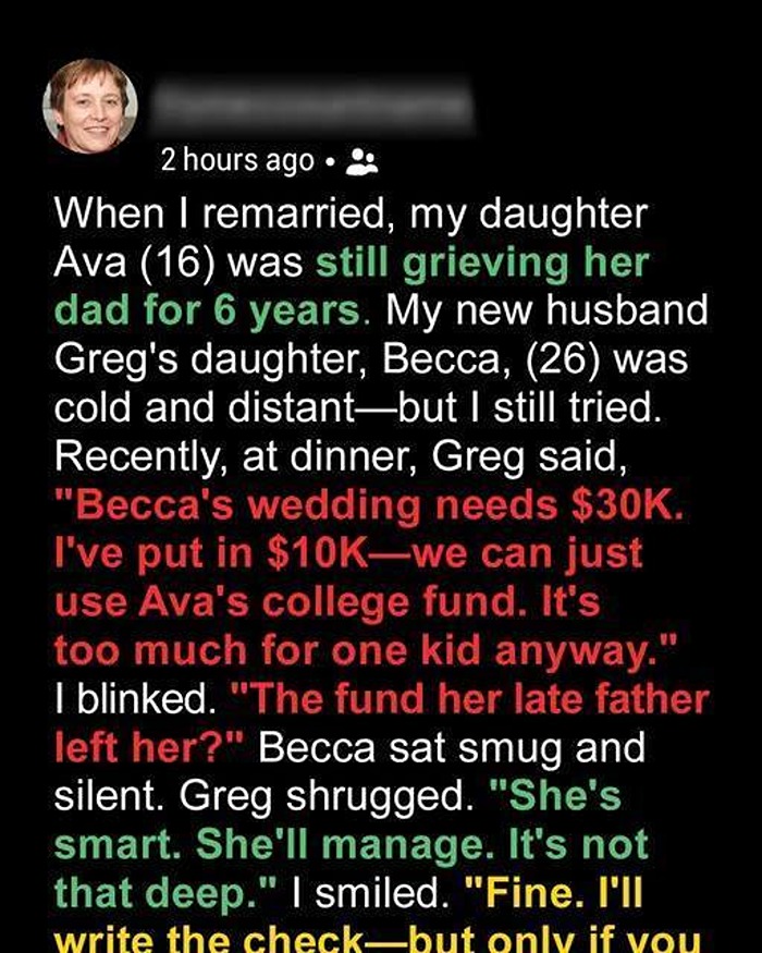 At dinner that night, as Ava talked excitedly about college, Greg suggested “borrowing” her fund — treating her future like spare change for Becca’s big day.