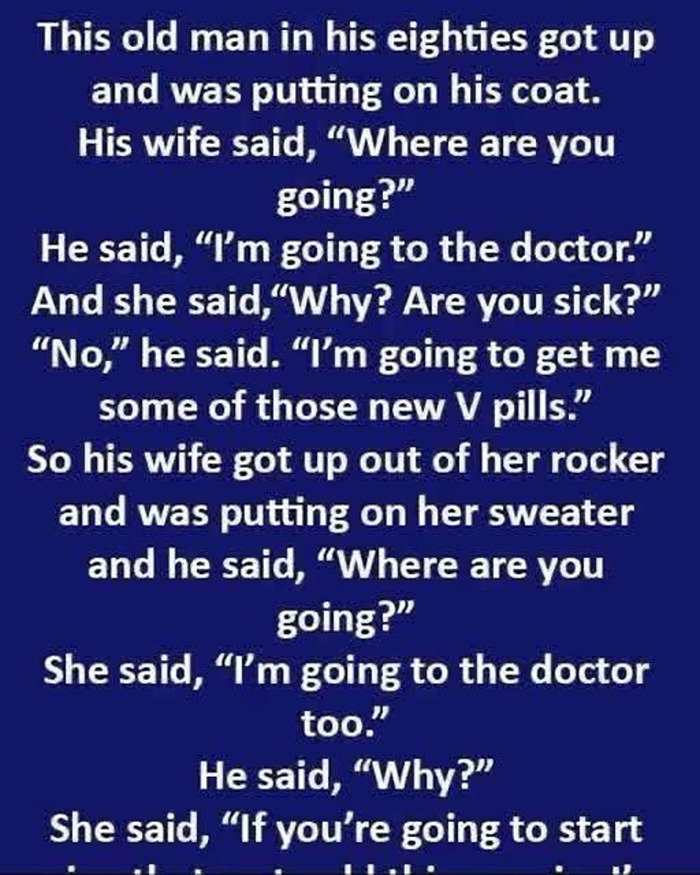 And she said,“Why? Are you sick?” “No,” he said. “I’m going to get me some of those new Via4ra pills.” So his wife got up out of her rocker and was putting on her sweater and he said, “Where are you going?”She said, “I’m going to the doctor too.” He said, “Why?”