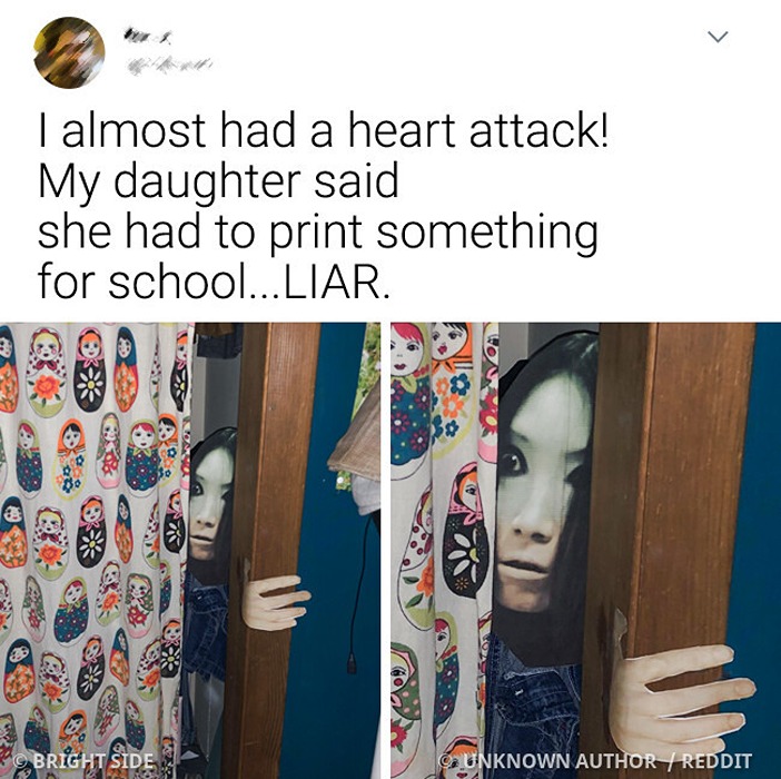 8. “Went to bed last night and almost had a heart attack. The child insisted she had to print something for school. LIAR.”