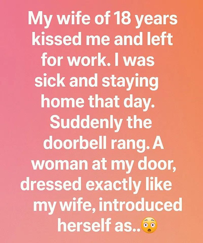 A woman at my door, dressed exactly like my wife, introduced herself as… my wife’s identical twin.