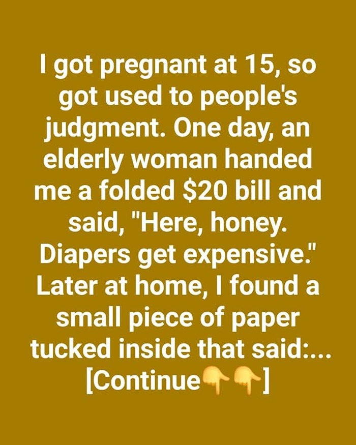 I got pregnant at 15, so I was used to people judging me. One day, an older woman gave me a folded $20 and said, “Diapers get expensive, honey.” When I got home, I found a small note inside. It said, “You’re stronger than you think.” Years later, I saw faint writing on the back—it was my name. I had never met her before. When I told my mom about it, she paused, then smiled. She said, “That woman was a neighbor I once helped when no one else would. She didn’t forget.”