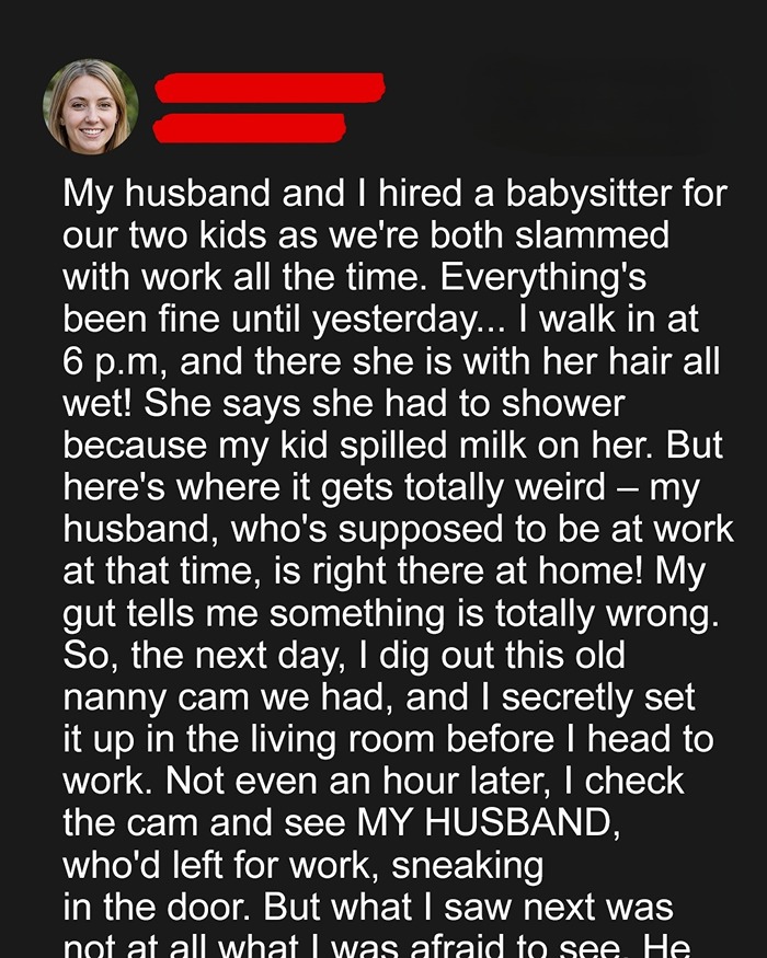 Okay, here’s the backstory, my hubby and I hired a babysitter for our three children as we’re both slammed with work all the time. Everything had been fine until yesterday… I walked in at 6 p.m., and there she was with her hair all wet! She said she had to shower because my kiddo spilled milk on her.