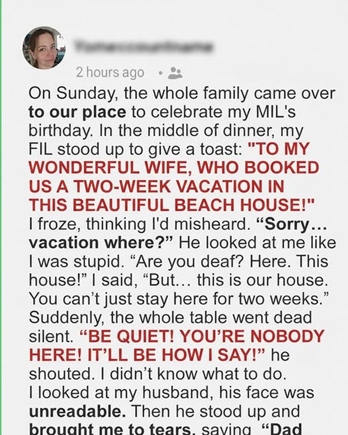 On Sunday, the whole family came to our home to celebrate my mother-in-law’s birthday. We were enjoying dinner when my father-in-law stood up with a smile and announced a surprise: “A big thank-you to my wife for booking us a two-week stay in this lovely beach house!” I blinked, confused. “Vacation where?” He gestured around the dining room. “Here, of course!” I took a breath and gently said, “Oh—this is our home, not a rental.” The room fell quiet, and I felt a knot in my stomach. I looked toward my husband, unsure how to respond.