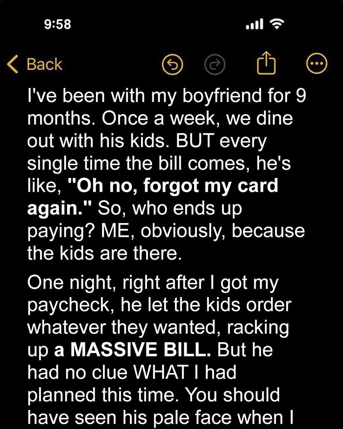 This is exactly the situation faced by a woman on Reddit’s popular “Am I The A*****e?” (AITA) forum, where many individuals seek outside opinions on their complicated and often emotional relationship issues. In her post, she shared the story of her relationship with her boyfriend, which has lasted for nine months. He has two daughters from a previous relationship, and the four of them have created a weekly tradition: they go out to eat together once a week. At first glance, this seems like a lovely family activity. She’s trying to connect with his kids, demonstrating her respect for their relationship, and aiming to create a positive atmosphere. It seems that every time we go out, things wrap up on a bit of a downer—the boyfriend has picked up this strange habit of always “forgetting” his wallet.