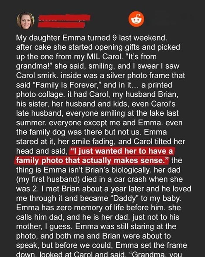 When my mother-in-law handed my nine-year-old daughter a “family photo” at her birthday party, I thought it was sweet. Until I saw what was inside that silver frame. Everyone was there, except us.