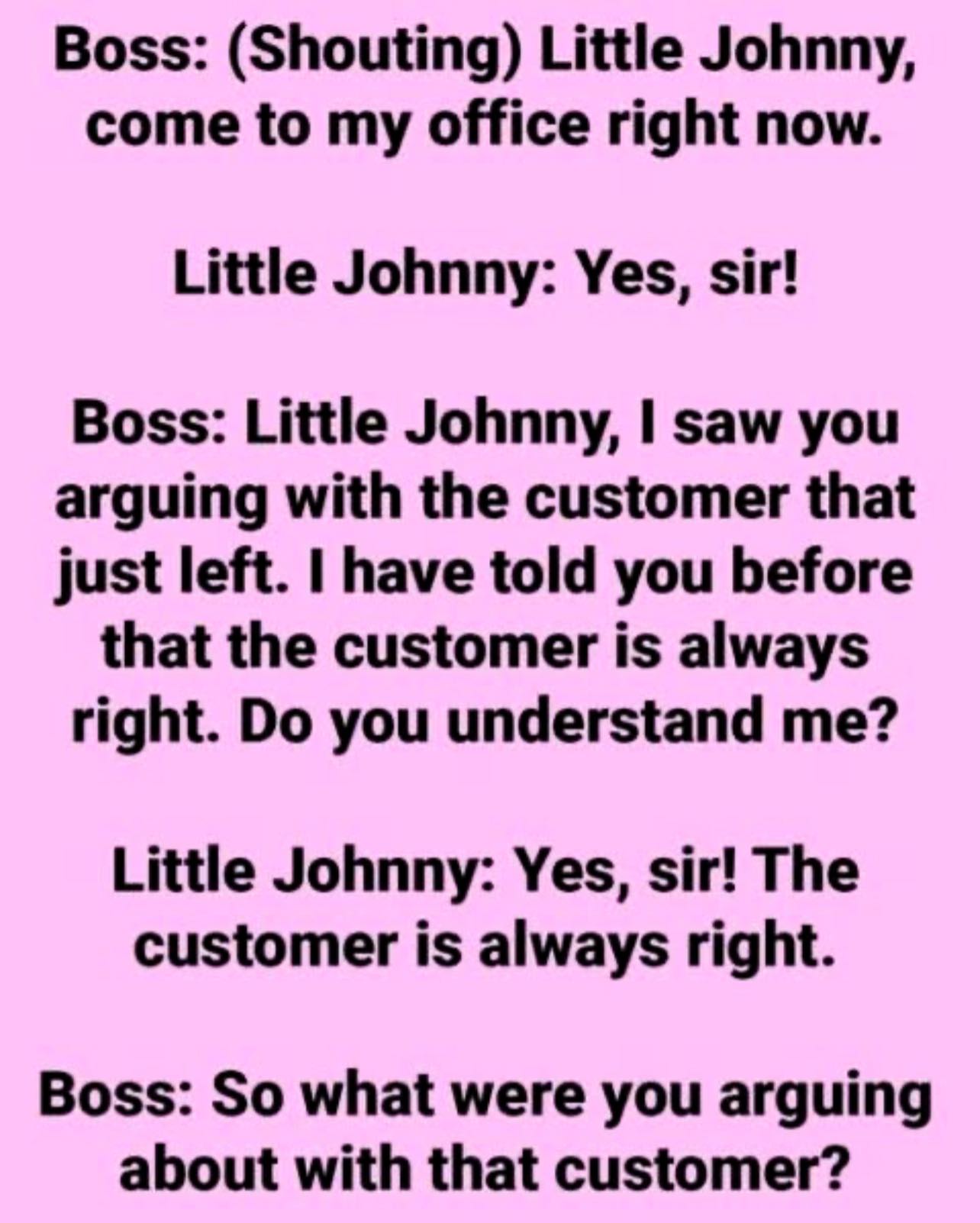 Boss: (Shouting) Little Johnny, come to my office immediately.Little Johnny: Yes, sir! Boss: Little Johnny, I noticed you arguing with the customer who just left. I’ve told you before that the customer is always right.