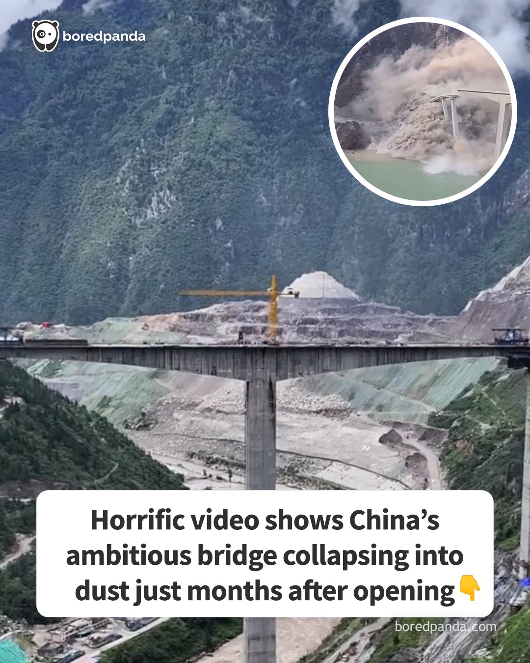 The footage shows the structure’s middle section giving way as the landslide hits, its long concrete span snapping like a twig before crashing into the valley below.