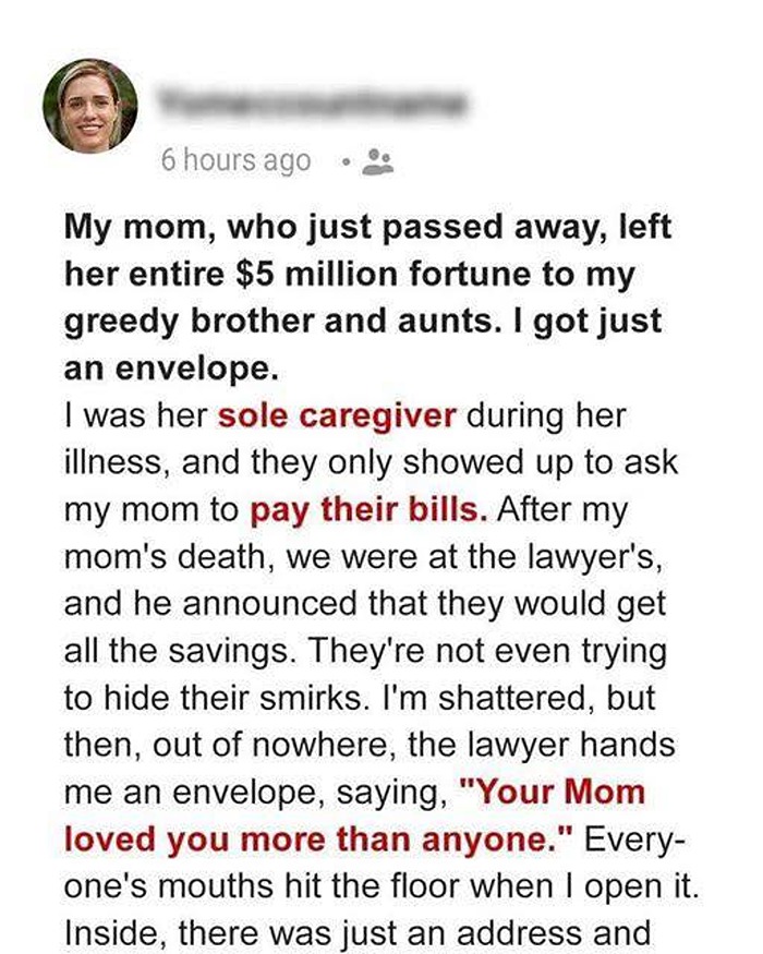 Just when she thought things couldn’t get any worse, the lawyer approached her, handing her an envelope. Trembling with anticipation, the woman opened it to find a simple address written on a piece of paper. Confused, she had no idea what awaited her at that location. Perhaps it was a storage unit her mother wanted her to clear out? The lawyer remained silent, only reminding her that she was truly the person her mother loved the most.