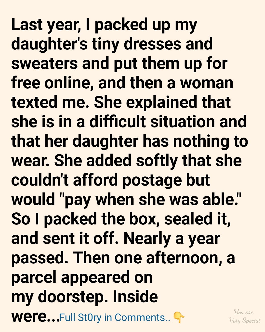 For a moment, I almost ignored the message. I was tired — still grieving my mom, busy with work, and just trying to hold things together. But something about her words felt real and heartfelt, so I couldn’t turn away. I packed the clothes, sealed the box, and sent it. It felt like a small, simple act of kindness — one I didn’t think about again. Sometimes we give without realizing how much it might mean later.
