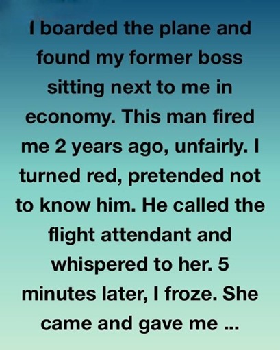 When I boarded that flight, I just wanted a quiet trip and maybe a little sleep. But fate had other plans. As I walked down the aisle, my stomach dropped — sitting in my assigned seat was my former boss, the man who’d fired me two years earlier. I froze, hoping he wouldn’t notice. But he did. He leaned toward the flight attendant and whispered something I couldn’t hear. Minutes later, she came back and smiled. “Sir, you’ve been upgraded to first class.” I stared, confused, until I glanced at him. He gave a small, awkward nod — a silent truce. My heart raced as I walked away, unsure if it was kindness… or guilt.