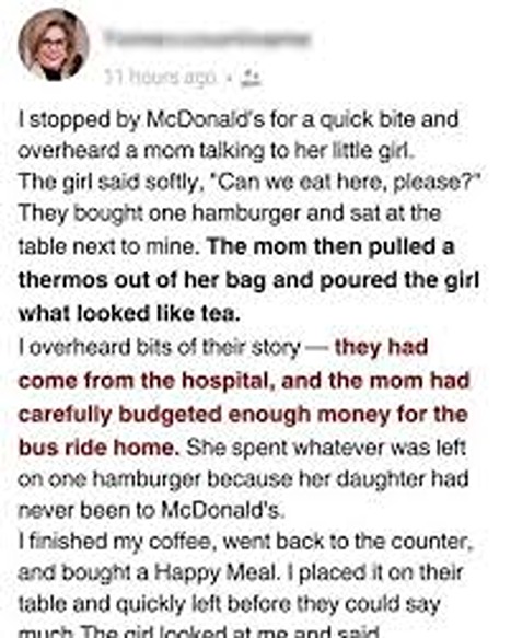 I stopped at McDonald’s for a quick meal and overheard a mom talking to her young daughter. The girl gently asked, “Can we eat here, please?” They bought one hamburger and sat beside me. The mom took out a thermos and poured the girl what looked like tea.