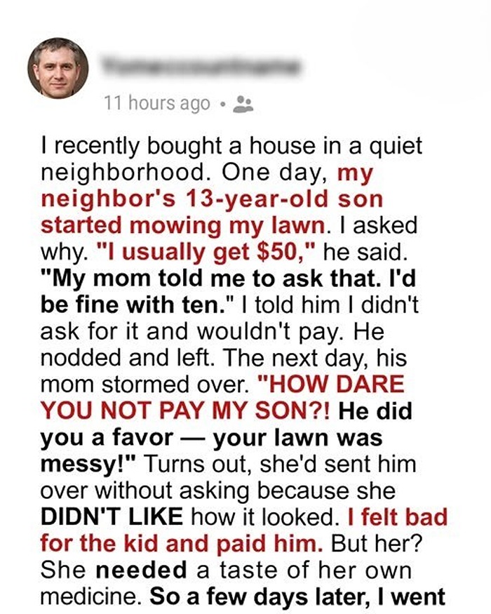 Homeownership is an American dream… until your neighbor thinks your lawn is her business. Mine sent her son to mow it without asking, then demanded $50. I refused and gave her a taste of her own logic…