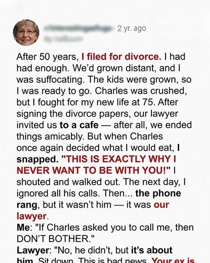 Small misunderstandings slowly turned into frequent disagreements, and feeling unheard, Rose made the painful decision to ask Charles for a divorce. Though heartbroken, Charles respected her wishes, quietly believing that love sometimes meant letting go. After their divorce, their longtime family lawyer invited them to dinner at their favorite restaurant as a gesture of kindness.
