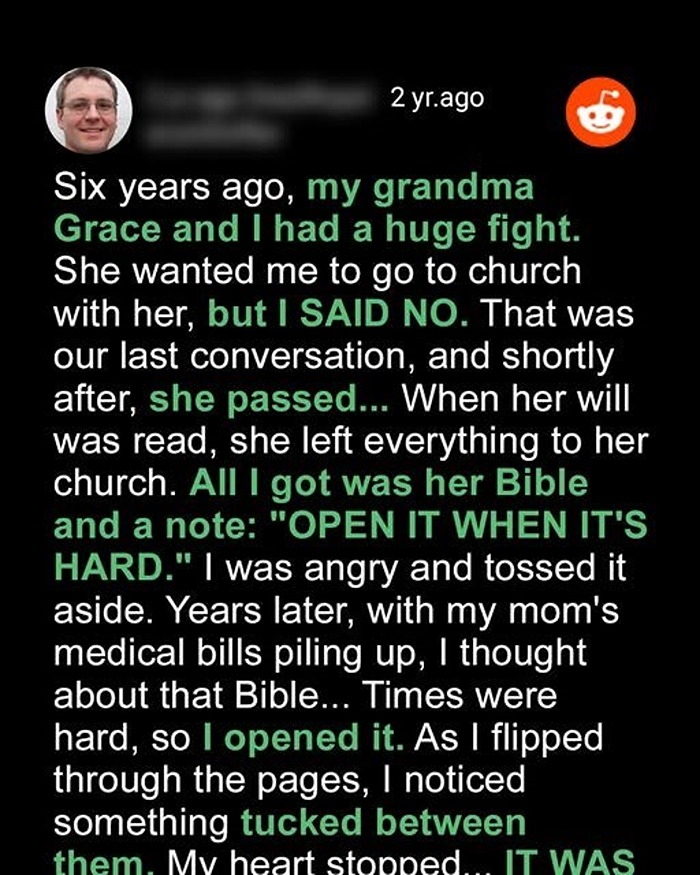 Page after page, hundreds of dollars poured out of the Bible. Eventually, Mike realized his grandmother had hidden thousands of dollars between the pages of the Bible.