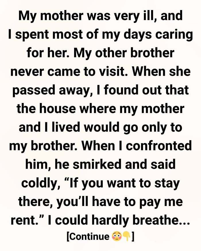 For my own home? For the house where I spent sleepless nights taking care of our mother? I felt betrayed—by him, and in some ways, by her too.