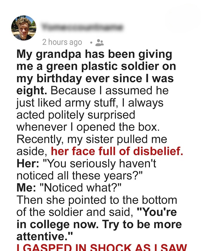 My grandfather gave me a single green plastic soldier every year on my birthday, never with a card or explanation. It wasn’t until after he passed that I discovered those tiny toys were part of a mystery for nearly two decades, just for me! I always looked up to my grandfather.