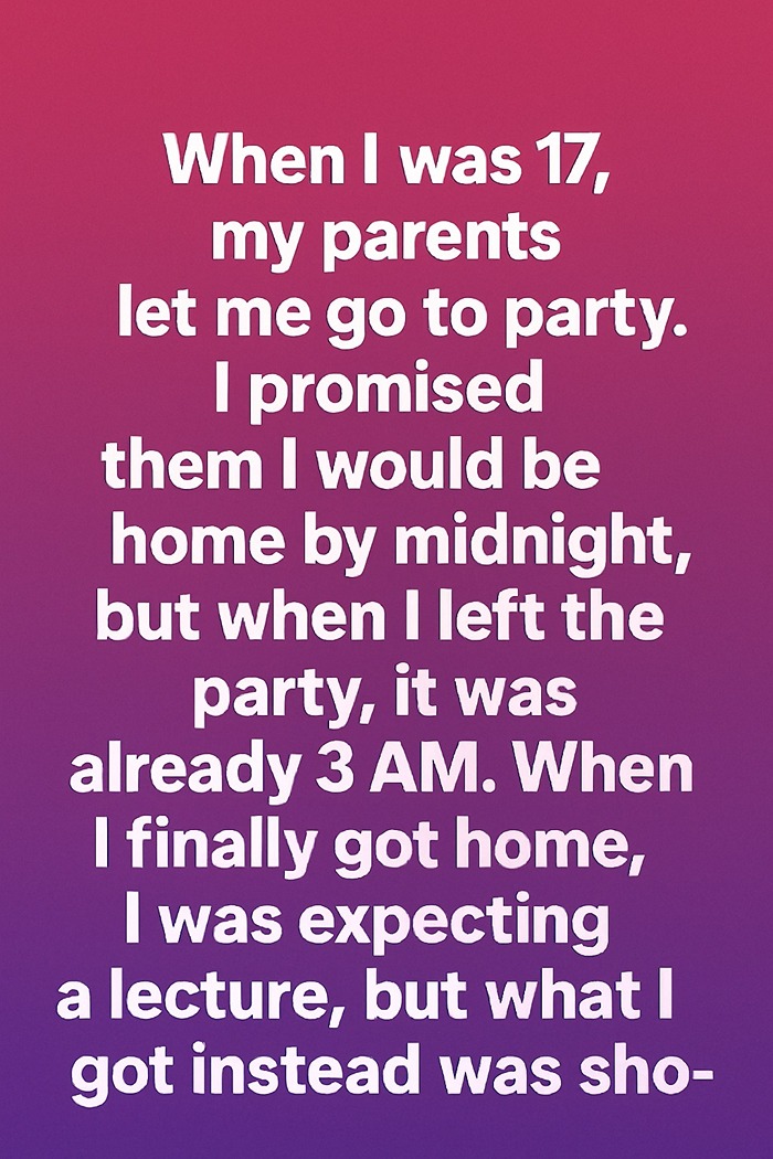 When I was 17, my parents let me go to a party. I promised them I would be home by midnight, but when I left the party, it was already 3 AM. When I finally got home, I was expecting a lecture, but what I got instead was sho— silence.