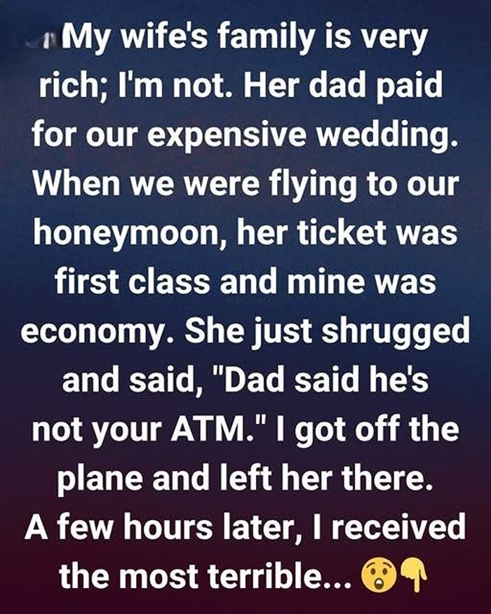That truth revealed itself during their honeymoon — a trip meant to celebrate love but instead exposed the gap between their worlds. When they arrived at the airport, Darren noticed something strange. His wife’s ticket said First Class, while his said Economy.