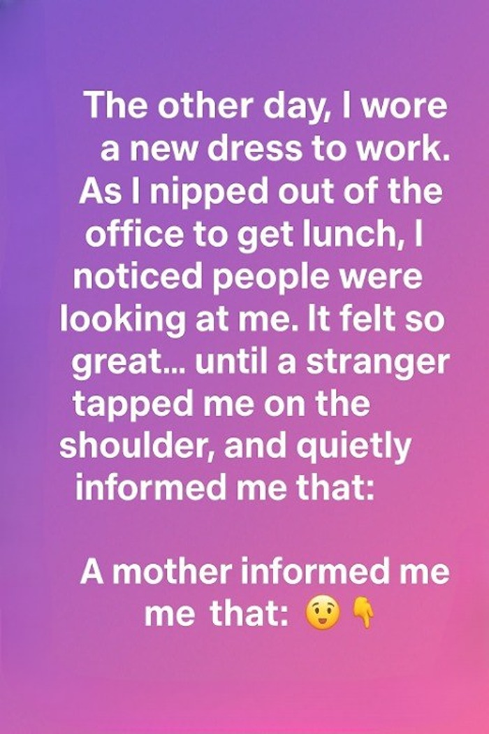 For a split second, I didn’t process what she said. Then my hand instinctively went to the side of my dress, and sure enough — there it was. The tag. Dangling freely for the world to see, bold letters and all.
